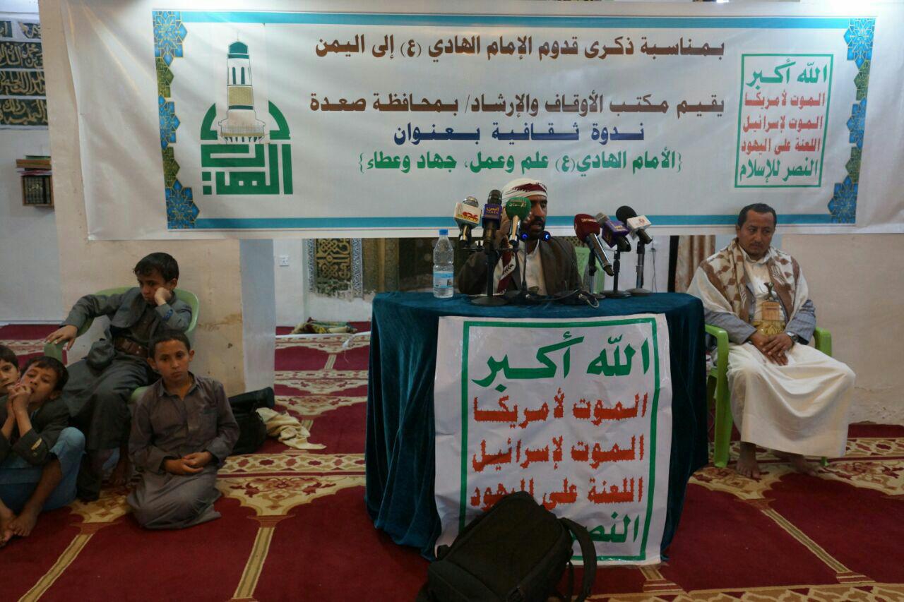 أقام مكتب الأوقاف والإرشاد بمحافظة صعدة ندوة ثقافية بمناسبة ذكرى قدوم الإمام الهادي (ع) الى اليمن بعنوان ” الإمام الهادي (ع) .. علم وعمل ، جهاد وعطاء ”