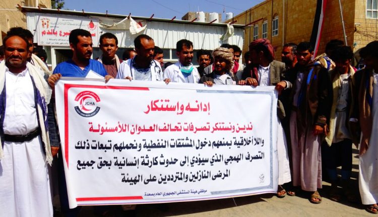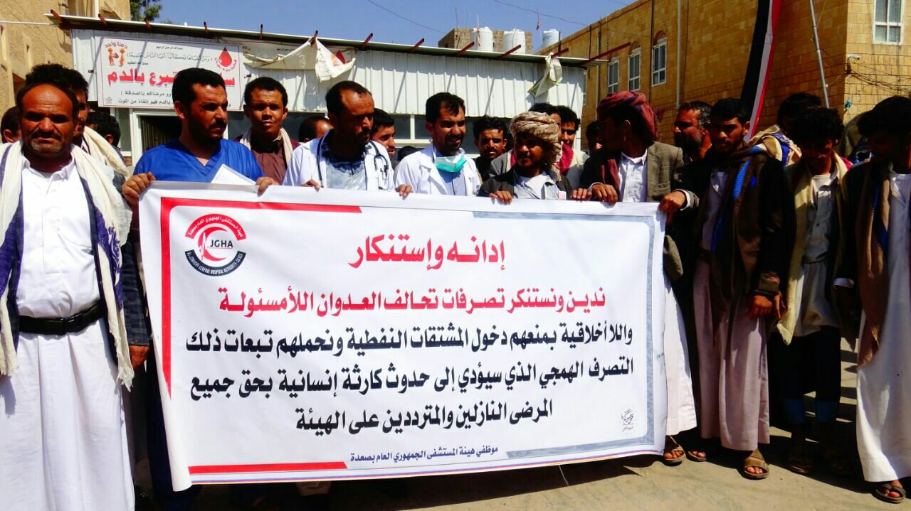 نظم موظفو المستشفى الجمهوري العام بصعدة اليوم وقفة احتجاجية للتنديد بإستمرار العدوان في احتجاز السفن النفطية والتنديد بالصمت الاممي .