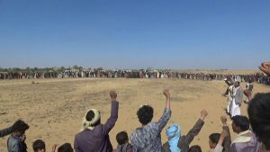 نظم أبناء عزلتي الغرير والحجر بمديرية ال سالم اليوم وقفة قبلية مسلحة لإعلان النفير العام وتنديدا واستنكارا بالجريمة التي ارتكبها العدوان في مديرية كتاف بحق اسرة ال العزي والتي راح ضحيتها خمسة شهداء بينهم طفلين وامرأة حامل ، وكذالك جريمة قتل 3 من أسرى الجيش واللجان الشعبية في سجون مرتزقة العدوان بمدينة مأرب.