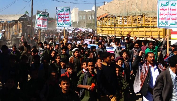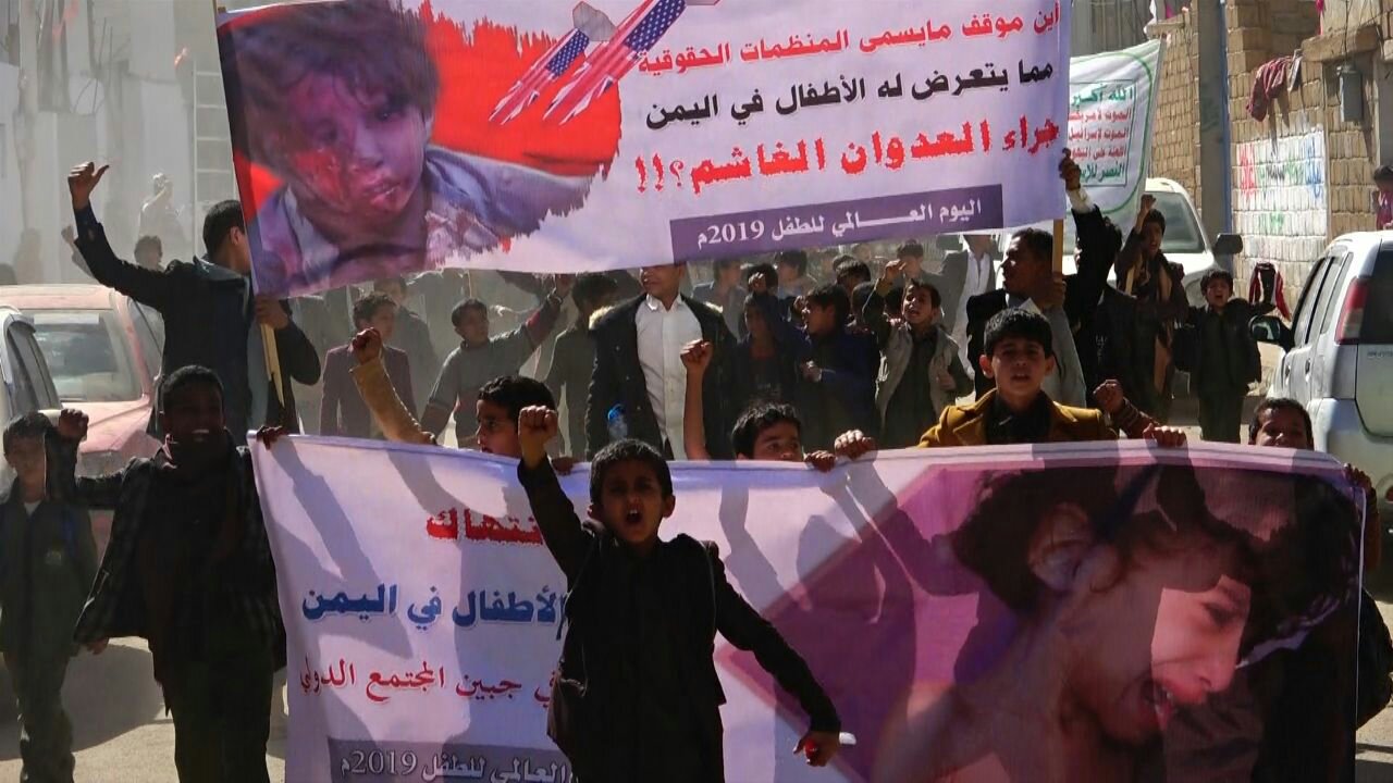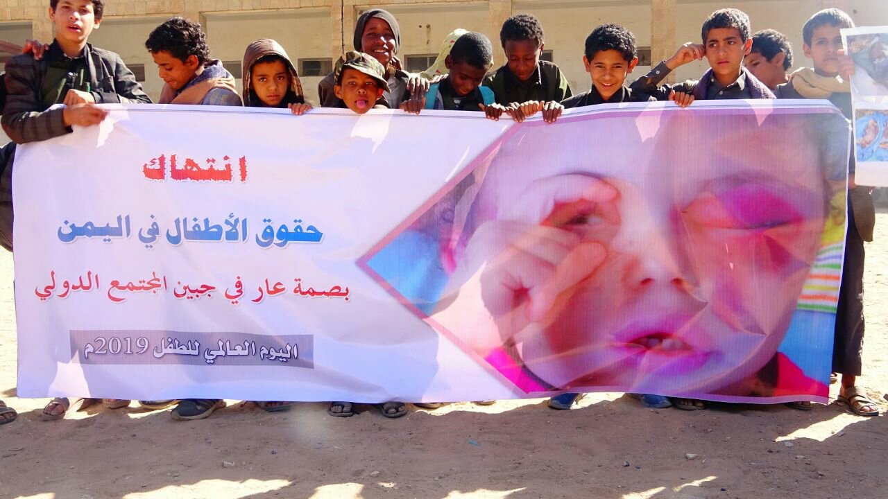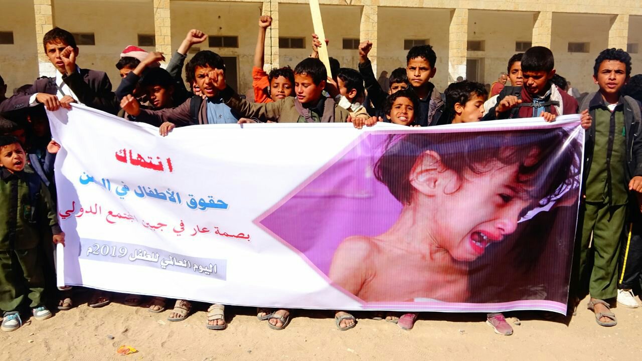صعدة : مسيرة غاضبة ووقفة احتجاجية لأطفال مديرية صعدة أمام منظمة رعاية الأطفال بالتزامن مع يوم الطفل العالمي