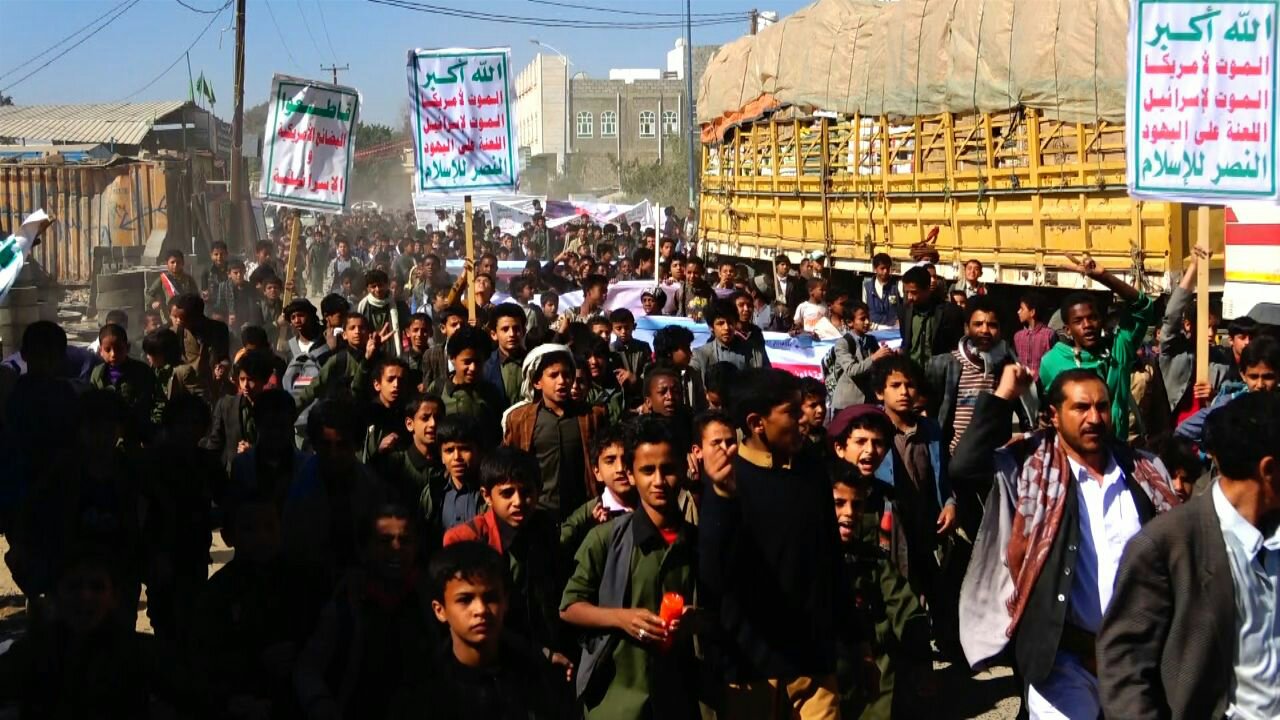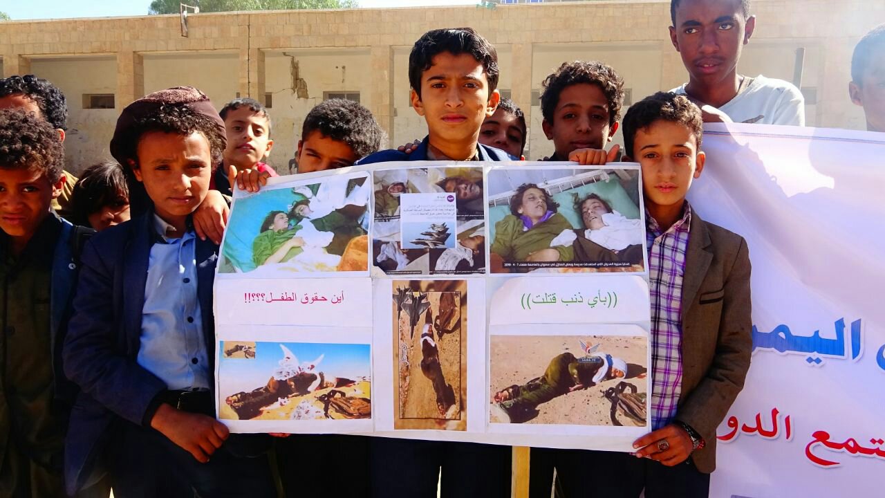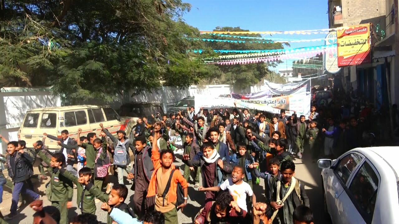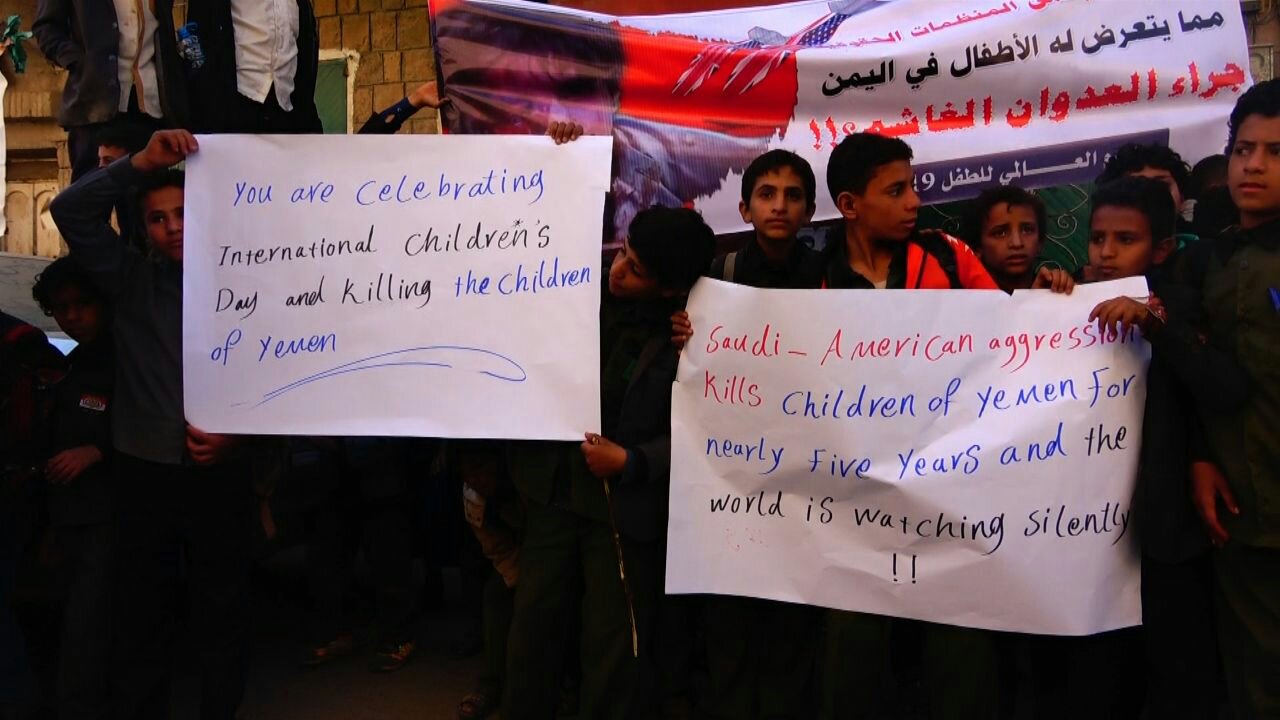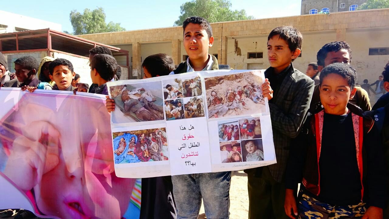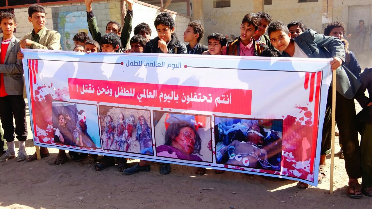 نظم أطفال مديرية صعدة صباح اليوم مسيرة غاضبة و ووقفة احتجاجية أمام مبنى منظمة رعاية الاطفال بمحافظة صعدة تنديدا بجرائم العدوان السعودي الأمريكي بحق أطفال اليمن .وفى الوقفة التى رفعت فيها الشعارات واللوافت والصور المعبرة عن جرائم العدوان بحق الأطفال في اليمن ، أدان الأطفال صمت الأمم المتحدة والمجتمع الدولي المعيب إزاء ما يتعرض له أطفال اليمن من انتهاكات وقتل وحصار من قبل تحالف العدوان السعودي الأمريكي منذ قرابة ثلاث سنوات .واستهجن الأطفال تغني الأمم المتحدة بإحياء يوم الطفل العالمي فيما أطفال اليمن يقتلون بقصف طيران العدوان والحصار والأمراض ومحرومون من كل حقوقهم.وناشد بيان الوقفة الذي قرأه احد الأطفال باللغتين العربية والإنجليزية كل الأحرار في العالم والمنظمات والهيئات الدولية لرفع الظلم عنهم وتمكينهم من حقوقهم المشروعة ووقف العدوان عن بلدهم ، والالتفات إلى ما يتعرضون له من جرائم وحرمانهم من حقهم في الحياة الذي كفلته كل الشرائع والمواثيق والقوانين الدولية.وأكد بيان الوقفة ان تحالف العدوان هدم مدارس الاطفال وقتل الاطفال بمدارسهم وفى منازلهم وفى الاسواق وقتل النساء وقتل المعلمين وشرد المواطنين وحاصر البلاد برا وبحر وجوا.حضر الوقفة مدير التربية بالمحافظة عبدالرحمن الظرافي وعدد من الشخصيات التربوية والإجتماعية والثقافية وعدد من أولياء أمور الطلاب .