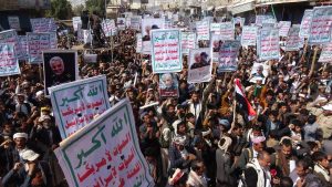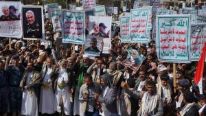ورددوا هاتفين “الله الله أكبر.. أمريكا الشيطان الأكبر”، “يا شعوب المنطقة.. أمتنا حرة حرة”، “لن نقبل بالأمريكان”، “من صعدة إلى بغداد.. نسلك خط الاستشهاد”، “عهدا منا بالوفاء.. لسليماني والشهداء”، و”دم الشهداء الأحرار يمحو دول الاستكبار”، “أمريكا إرهابية.. نحن شعب الحرية”.