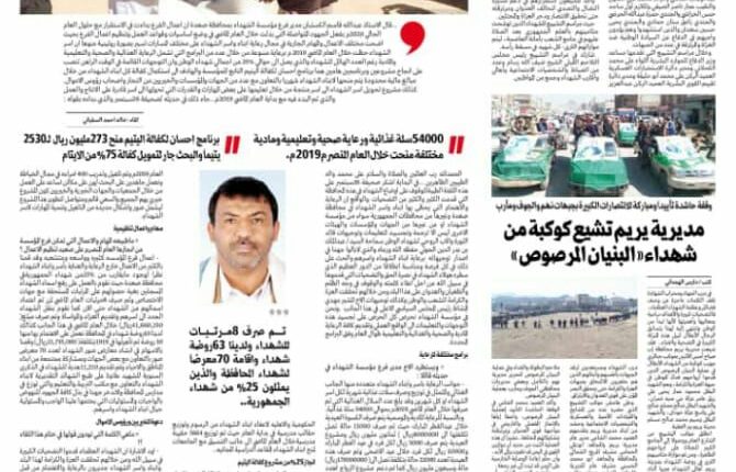 _ نبذل جهود متواصلة لرعاية اسر وابناء الشهداء تجسيدا لتوجيهات وتعليمات القيادتين السياسية والثورية.54000سلة غذائية ورعاية صحية وتعليمية ومادية مختلفة منحت خلال العام المنصرم2019 م. برنامج احسان لكفالة اليتيم منح 273مليون ريال ل2530 يتيم والبحث جاري لتمويل كفالة 75% من الايتام ._ تم صرف 8مرتبات للشهداء ولدينا 63روضة شهداء واقامة 70معرض لصور شهداء المحافظة.والشهداء قرابة 25% من شهداء الجمهورية..لقاء /خالد احمد السفياني….قال الاستاذ عبدالله قاسم الكستبان مدير فرع مؤسسة الشهداء بمحافظة صعدة ان اعمال الفرع بداءت في الاستقرار مع حلول العام الحالي 2020م بفعل الجهود المتواصلة التي بذلت خلال العام الماضي في وضع اساسيات وقواعد العمل وتنظيم اعمال الفرع بحيث اضحت مختلف الاعمال والمهام.الجارية في مجال رعاية ابناء واسر الشهداء على مختلف المسارات تسير بصورة روتينية منوها ان اسر الشهداء حظت خلال العام الماضي 2019 م برعاية متنوعة من خلال عدد من البرامج التي تشمل الرعاية الغذائية والصحية والتعليمية والمادية رغم العدد الهائل للشهداء والذي يصل الى حوالي 25% من اجمالي شهداء الوطن وان التوجهات القائمة في الوقت الراهن تنصب على انجاح مشروعين وبرنامجين هامين هما برنامج احسان لكفالة اليتيم التابع للمؤسسة والهادف الى استكمال كفالة كل ابناء الشهداء من خلال مبالغ مالية محدودة يتم منحها لابناء الشهداء شهريا بالتعاون مع عدد من الجهات والمؤسسات والخيريين من التجار واصحاب رؤوس الاموال. كذلك مشروع تحويل اسر الشهداء الى اسر منتجة من خلال تعليمها على بعض المهارات والقدرات التي تحولها الى اسر قادرة على الانتاج والعمل والذي تم البدء فيه مع بداية العام الماضي 2019م…جاء ذلك في حديثه لصحيفة 26سبتمبر والذي.بداءه بقوله :_ الحمدلله رب العالمين والصلاة والسلام على محمد واله الطيبين الطاهرين …في البداية اشكر صحيفة 26سبتمبر على هذه اللفتة الطيبةللوقوف على اوضاع الشهداء في هذه المحافظة التي قدمت الكثير والكثير من التضحيات .والواقع ان الرعاية والاهتمام التي يحظى بها ابناء واسر الشهداء في محافظة صعدة وغيرها من محافظات الجمهورية سواء من مؤسسة الشهداء او من غيرها من الجهات والمؤسسات والهيئات الاخرى ليس الا ترجمة وتجسييد لتعليمات وتوجيهات قائد الثورة والاب الروحي لشهداء الوطن سماحة السيد / عبدالملك بن بدر الدين الحوثي حفظه الله ورعاه والذي لايالوا جهدا في اصدار توجيهاته برعاية ابناء الشهداء واسرهم والحث على ذلك في كل فرصة ومناسبة انطلاقا من الدور العظيم الذي سطره هولاء الشهداء في نصرة الحق والتضحيات التي قدموها في سبيل الله من اجل اعلاء كلمته والوقوف في وجه الظلم والطغيان والعدوان على هذا البلد ومن خلالهم تحققت العزة والكرامة للشعب والوطن وكذلك توجيهات.الاخ المشير مهدي المشاط رئيس المجلس السياسي الاعلى في هذا الجانب .ونحن في مؤسسة الشهداء نحرص كل الحرص على تجسيد هذه التوجهات والتعليمات الى الواقع العملي وتقديم كافة الرعاية المادية والصحية والغذائية والتعليمية طوال العام وفق البرامج المحددة.** برامج مختلفة للرعاية:_ويستطرد الاخ مدير فرع مؤسسة الشهداء في حديثه قائلا :_ جوانب الرعاية باسر وابناء الشهداء متعدده منها الجانب الغذائي والمتمثل في توزيع وصرف سلات غذائية شهرية لكل اسر الشهداء او كل شهرين وقد بلغ عدد السلال الغذائية التي تم صرفها خلال العام الماضي 2019م بحوالي 54ِ000سلة غذائية.وبالنسبة للرعاية المادية والموسمية يتم صرف الكسوة العيدية خلال عيدالفطر المبارك حيث تم صرف 11ِ000حالة تصل تكلفتها الى (80ِ000ِ00 ريال ) ثمانون مليون ريال ومشروع العيدية يتم صرف 5000 ريال لكل فرد في عيد الفطر المبارك و10000 ريال لكل فرد خلال عيد الاضحى وتم صرف هذه العيدية لعدد 22000 حالة بتكلفة تصل الى( 170ِ000ِ000ريال) مائة وسبعون مليون ريال كما تم دعم مشروع الزواج لعدد 195 فرد من ابناء الشهداء بمبلغ( 21ِ870ِ000ريال) واحد وعشرون وثمانمائة وسبعون ال