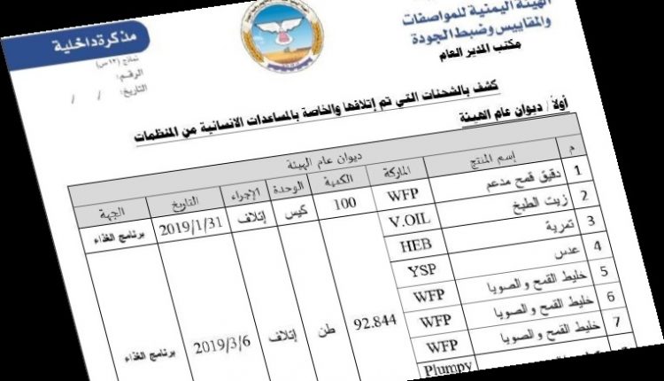 وبحسب الكشف، فقد قام ديوان عام الهيئة اليمنية للمواصفات والمقاييس، منذ نهاية يناير 2019، وحتى منتصف أكتوبر 2019، بإتلاف ما يقارب (385) طناً من مواد (دقيق القمح الأبيض والبسكويت وخليط القمح والصويا والعدس والمكملات الغذائية والسكر والزيت)، إلى جانب قرابة ألف كيس من (البقوليات ودقيق القمح المدعم)، وكل هذه المواد تم إدخالها عبر برنامج الغذاء العالمي.
