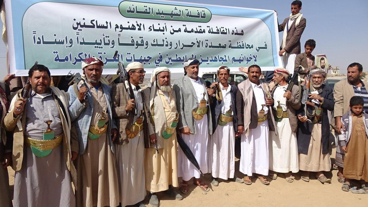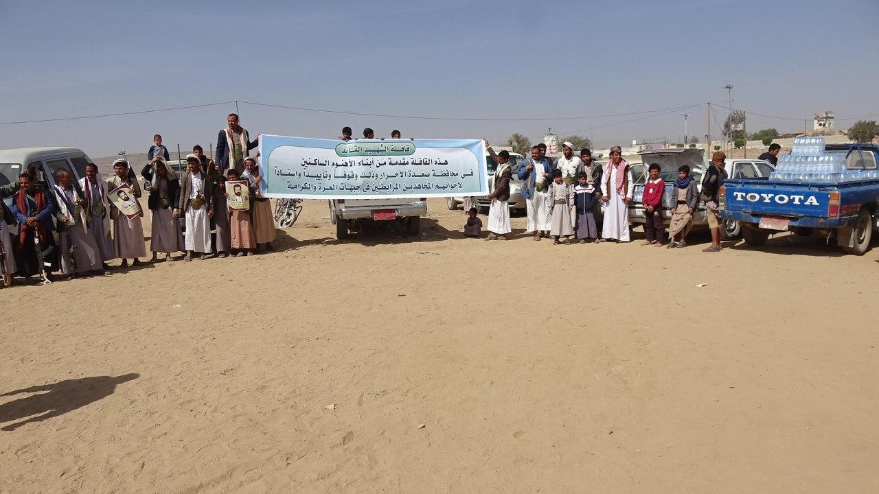 سير أبناء وقبائل الأهنوم من مديريتي شهارة والمدان الساكنين بمحافظة صعدة اليوم قافلة غذائية متنوعة بأسم ” قافلة الشهيد القائد ” لأبطال الجيش واللجان الشعبية وذلك بمناسبة الذكرى السنوية للشهيد القائد .