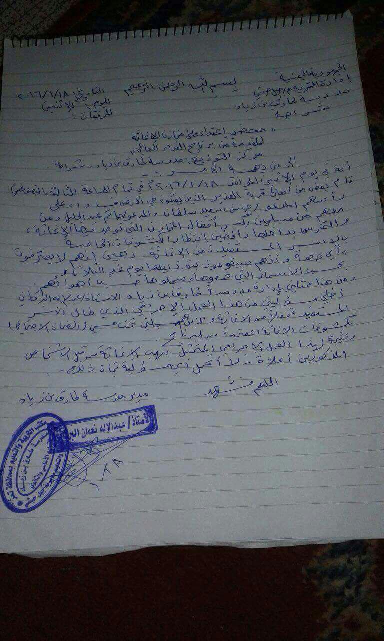 تعز|20يناير|صعدة:نيوز:في مدرسه الرشيد تم التقطع لسيارات النقل الخاصه بـ إلاغاثه وأخذ جزء من الكميه التي كانت علي متن احدي السيارات من قبل عصابه مسلحه من قريه الوكيع عزله البريهه جبل حبشي .