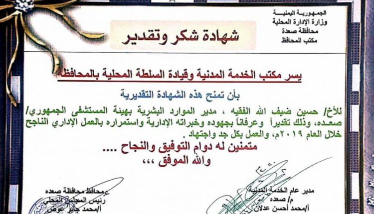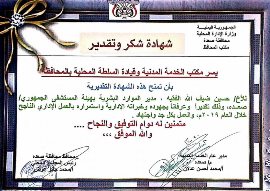 كرمت قيادة محافظة صعدة ممثلة بمحافظ المحافظة رئيس المجلس المحلي للمحافظة محمد جابر عوض مدير عام الموارد البشرية لدى المستشفى الجمهوري العام بصعدة الدكتور حسين ضيف الله الفقيه.