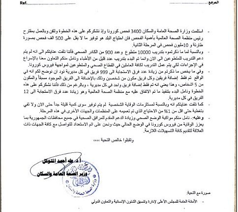 - وبالنسبة لما ما ذكرتموه بتدريب 10000 متطوع وعدد 900 من الكادر الصحي فإننا نلفت عنايتكم إلى أنه لم يتم دعم التدريب للمتطوعين إلى الآن وإنما تم البدء بتدريب عدد قليل من الأطباء ونأمل منكم التعاون معنا بالإسراع في الإجراءات لكي يتم عمل التدريب لكافة العاملين في القطاع الصحي والمتطوعين لمواجهة فيروس كورونا.