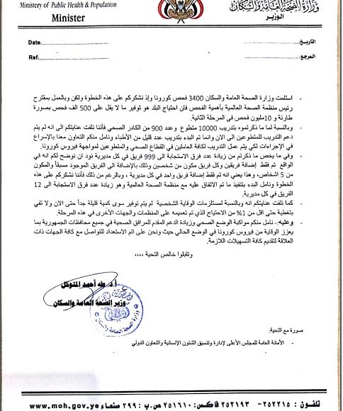بالإشارة إلى الموضوع أعلاه نشكر لكم تعاونكم والوكالات التابعة للأمم المتحدة بالدعم المقدم لتعزيز القطاع الصحي في البلد وبخصوص تصريحكم بتاريخ 23 أبريل بعنوان ” المنظمات الإنسانية تسابق الزمن لمساعدة اليمن في مواجهة فيروس كوفيد -19 فإننا وبعد الاطلاع على التصريح نود أن نوضح التالي: