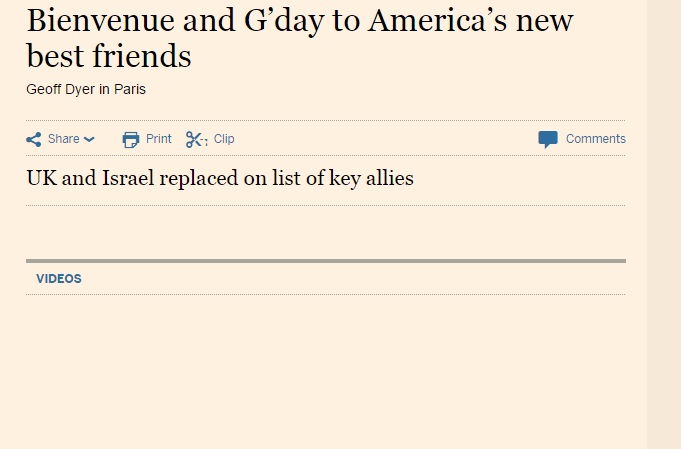 نشرت صحيفة الفاينانشل تايمز مقالة للكاتب البريطاني المعروف جيوف دايراعتبر فيها الاخير ان فرنسا واستراليا قد حلّتا مكان المملكة المتحدة وإسرائيل كافضل اصدقاء وشركاء اميركا. واشار الكاتب الى ان بريطانيا اصبحت منشغلة بقضايا داخلية، بينما هناك علاقة شخصية سيئة بين قادة اسرائيل والولايات المتحدة، مشدداً بالوقت نفسه على أن كيان الاحتلال مسبب اساسي للمشاكل الهائلة التي تجتاح الشرق الأوسط.