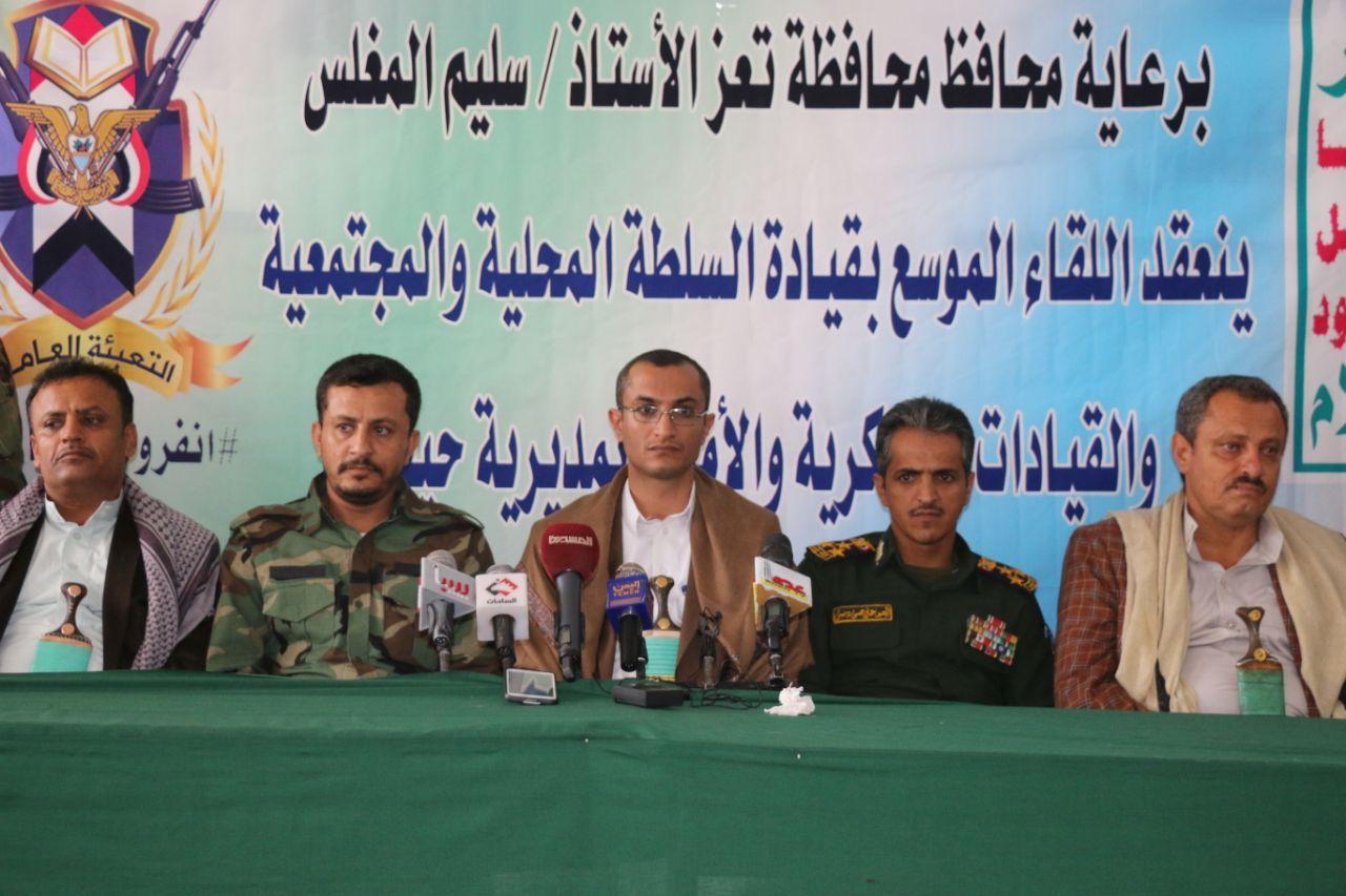 عقد بمديرية حيفان بمحافظة تعز لقاءً موسعاً بمشائخ ووجهاء وأعيان مديرية حيفان وقيادات السلطة المحلية والتنفيذية والمجتمعية والعسكرية والأمنية برئاسة محافظ محافظة تعز الأستاذ سليم المغلس، وبحضور مساعد قائد المنطقة العسكرية الرابعة العميد محمد يحي الخالد، وعدد من وكلاء ومدراء عموم المحافظة، وقيادة السلطة المحلية والتنفيذية والمشائخ والأعيان والوجهاء والقيادات العسكرية والأمنية بالمديرية .
