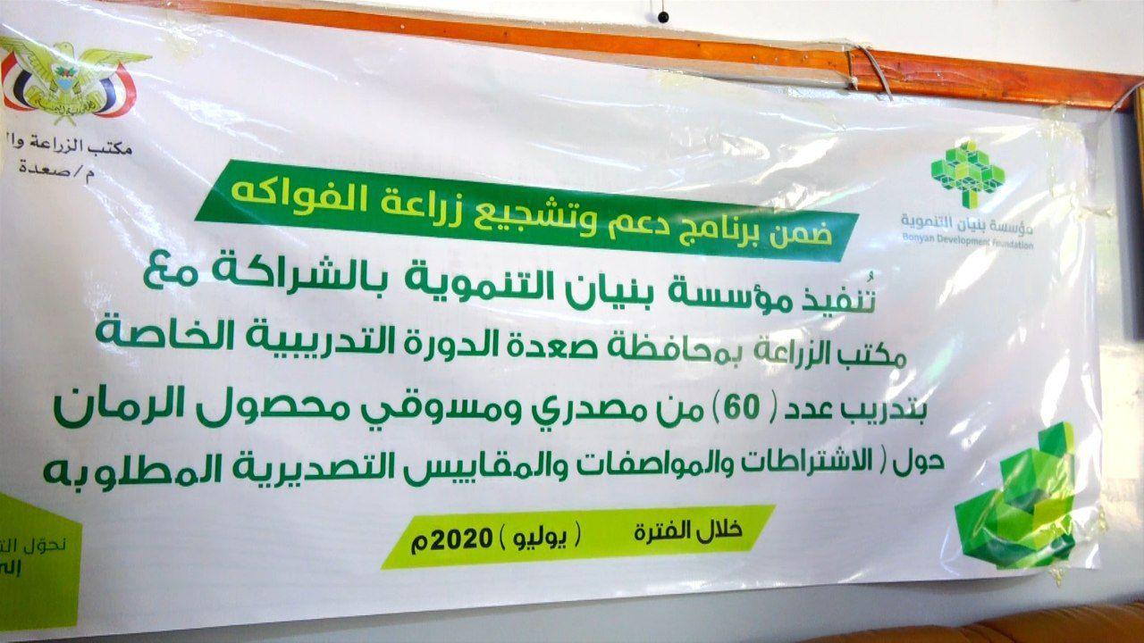 بدأت بمحافظة صعدة اليوم دورة تدريبية لمصدري ومسوقي محصول الرمان، تنظمها مؤسسة بنيان بالشراكة مع مكتب الزراعة بالمحافظة ومؤسسه الإرتقاء التعاونية الزراعية.